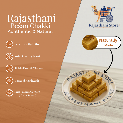 Besan Chakki (also known as Rajasthani Besan Barfi or Magas) is a royal delicacy that stands as a cornerstone of Rajasthani confectionery. Unlike common gram flour sweets, an authentic Besan Chakki is defined by its coarse, “Danedar” (grainy) texture and a deep, nutty aroma that comes from slow-roasting ingredients in pure desi ghee.In Marwari culture, it is more than just a sweet; it is a symbol of hospitality, often served to guests during festivals like Diwali, Holi, and at traditional wedding feasts.