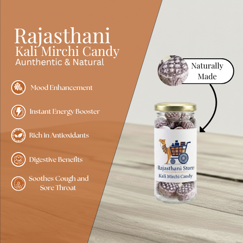 Kali Mirchi Candy (Black Pepper Candy) is a unique Indian hard-boiled confection that blends a sugary base with the sharp, pungent heat of black pepper. Unlike traditional fruit sweets, this candy is valued both as a bold treat and a functional lozenge for throat comfort.