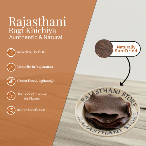 Ragi Khichiya (also known as Nachni Khichiya) is the “superfood” version of the traditional Indian Khichiya papad. While most Khichiyas are made from refined white flours (like rice or maida), this variety uses Finger Millet (Ragi). It is a rustic, dark-colored, and highly nutritious cracker that has gained immense popularity among health-conscious consumers for its gluten-friendly and mineral-rich profile.