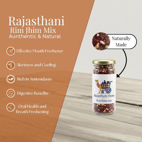 Rim Jhim Mix is a playful and vibrant Indian mouth freshener (mukhwas) known for its light, “rain-like” crunch and refreshing sweet-and-sour flavor profile. The name Rim Jhim (evoking the sound of a light drizzle) reflects the mix’s airy texture and the refreshing sensation it provides to the palate after a meal.
